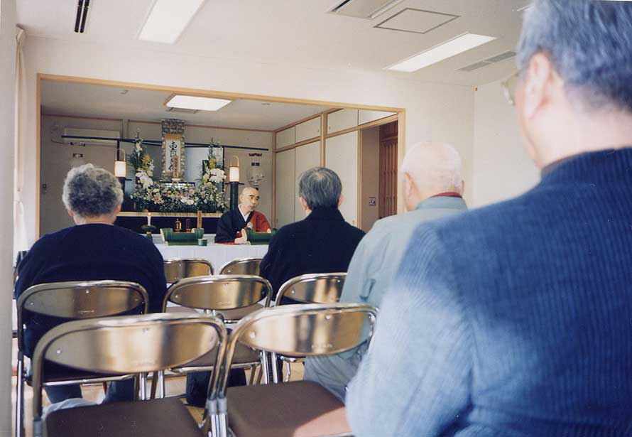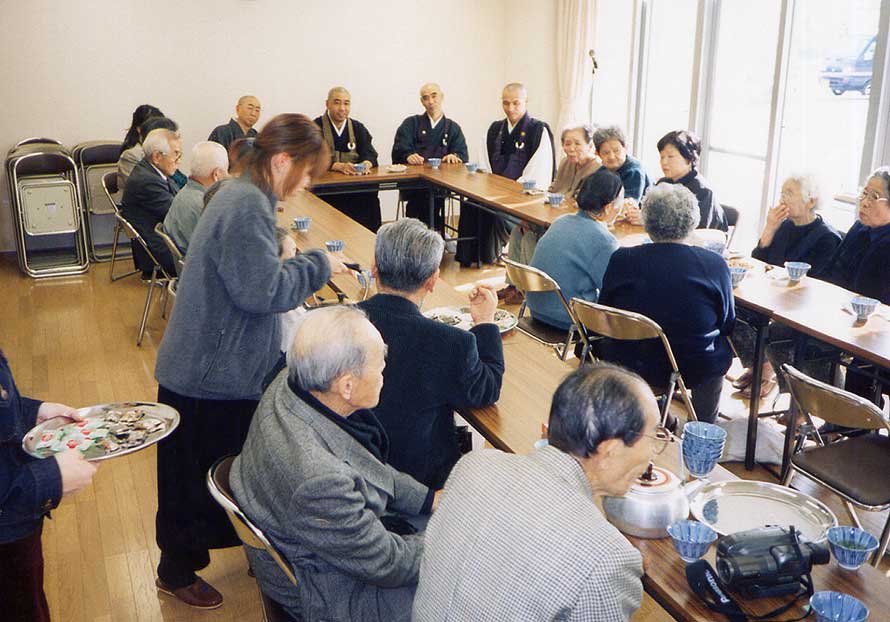 式も終了し、僧侶の方を囲んでの団らんの時となった。20人ほどの方が残って輪に加わる。話がなんとなく進まないので、荒木師からみなさんに話しかけていった。雲仙・普賢岳噴火災害のあった島原の対岸にある熊本、天草から来ていることや、震災以来しばしば神戸に顔を出していることなど、荒木師の自己紹介から進んでいった。藤井師も長田で識字教室を行っていることなど、優しい口調で丁寧に話している。いつもはボランティア仲間の友人として接しているが、さすが堂々とした僧侶としてのオーラすら感じる語りである。やはり僧侶の方々は、普段から多くの檀家さんなどと接していることもあり、こうした場での話のコツというものをそれぞれが持っている。そうした同じ空間にいるだけでも癒され心も開いてくる。