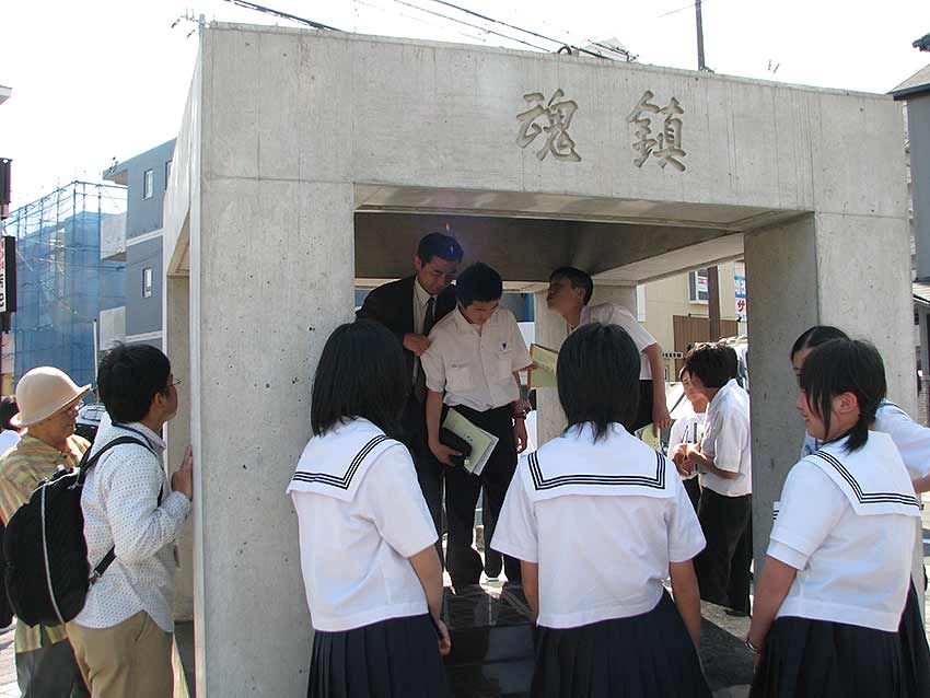 まち歩きでは、御蔵通5・6丁目を中心に回ります。半分やけどを負ったクスノキや、被災体験を生かして作られた南公園、力を合わせて建てた自治会館、心のこもった慰霊碑「鎮魂」、焼け跡が生々しい電柱などを、語り部さんの案内で回ります。質問時間に聞けなかったのか、語り部さんに熱心に質問する生徒もいます。