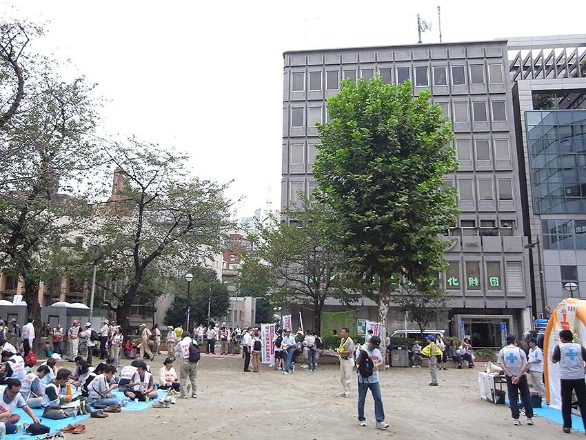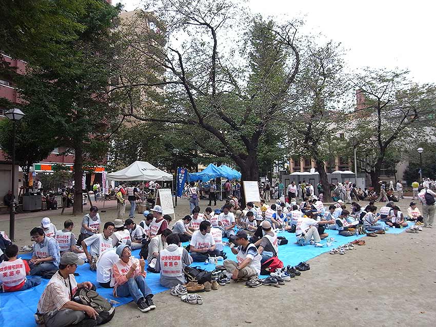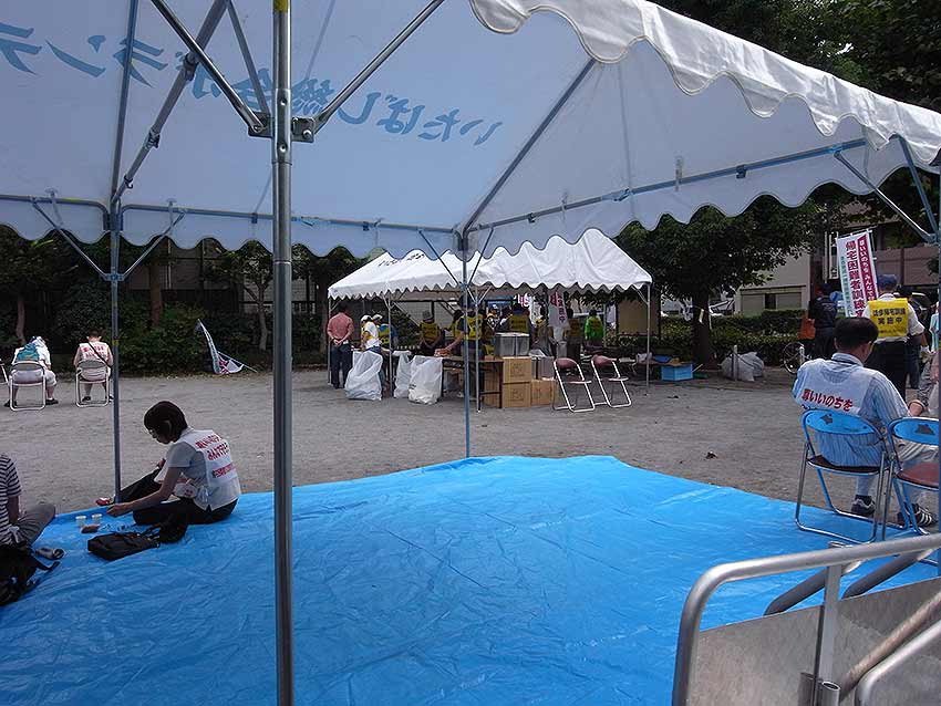中池袋公園には花見のようにたくさんのブルーシートが広げられ、すでに多くの参加者が休息していた。ここは日比谷公園からは9kmくらいの地点だ。マッサージの大きなテントや炊き出しのテントなどもある。池袋駅から5分程度の場所にありながらも、ちょうど豊島区役所の裏でサンシャインの麓という隠れたスポットだった。今までこんな所に公園があることを知らなかったが、いろいろな街でこうした公園の場所を覚えておくのも一つの保険かもしれない。