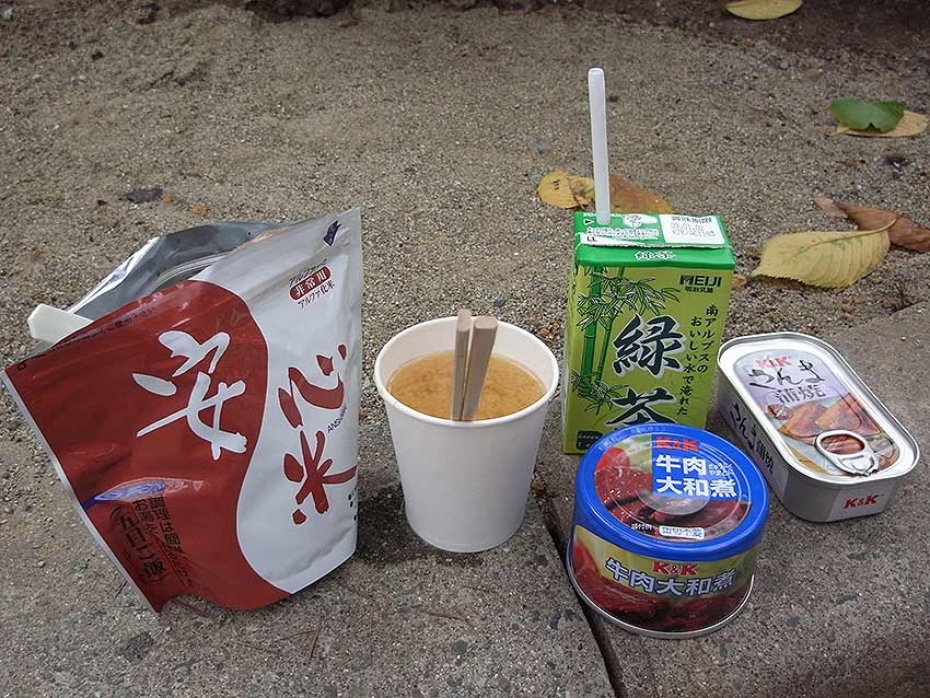 炊き出しの列に並び、支援物資をゲットする。インスタントみそ汁とアルファ米の五目ご飯、缶詰2個とお茶という構成。シートの上でゆっくりと昼食をとった。靴を脱いで座って休めるということは、ことのほかリラックスできる。ブルーシート1枚敷いているだけなのだが、これが結構なポイントであることに、座ってみて初めて気がついた。
