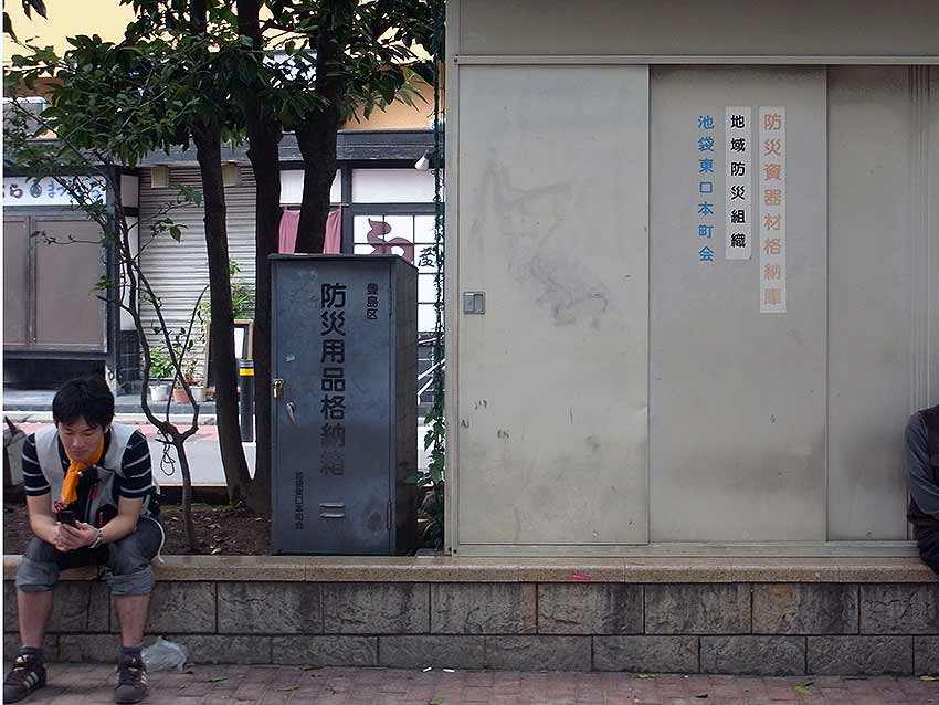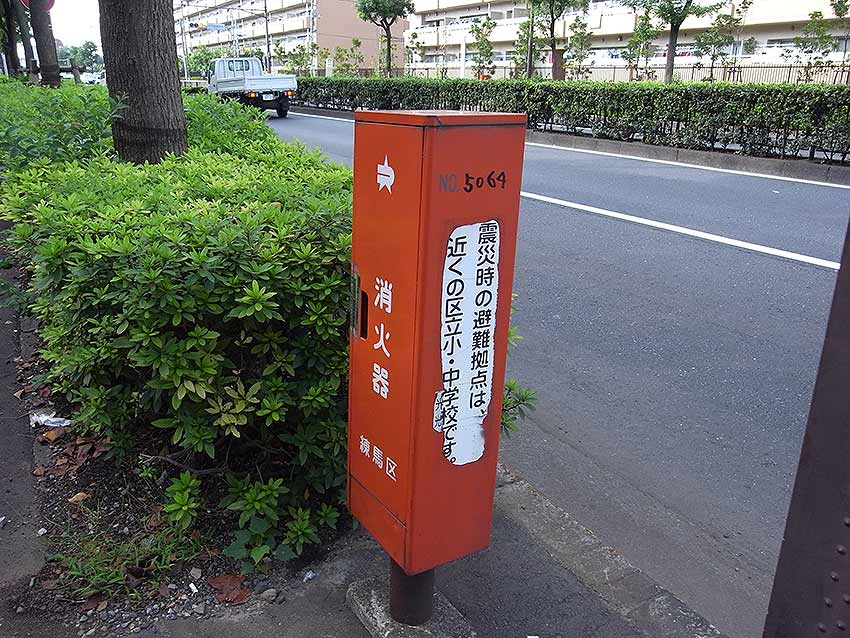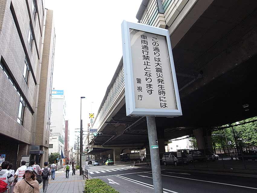 30分ほど休んで出発。明治通りの六差路を通り線路を超え、いよいよ山手線の円の外を出た。延々長野県松本市まで続く国道254号線、通称川越街道に入る。再び日差しが強くなってきたので、なるべく日陰の多い所を選んで歩く。この川越街道は交通量も多いが、歩道はそれほど広いわけでもない。自転車が通るとさらに狭くなる感じだ。所々に立てられている標識にあるように、震災時にはこうした街道は緊急車両を除いて通行止めになる。一般車はキーを付けたまま車を端に寄せ、乗り捨てなければならない。その場合でも緊急車両のために車道を空けるので、歩道には人が殺到するだろうとの想像が簡単につく。