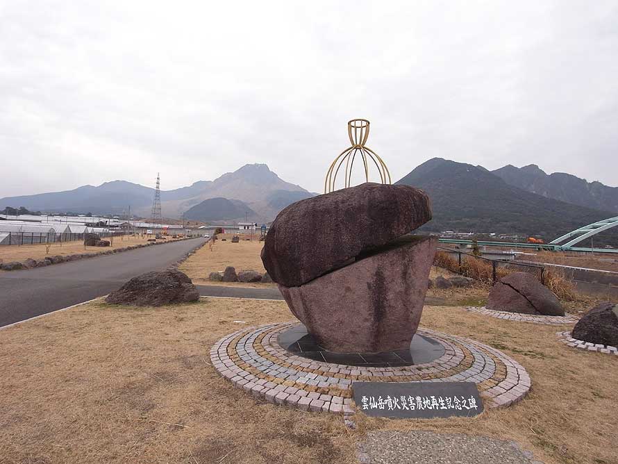 実際に歩くルートの辺りは、一面農地で噴火災害時には火砕流や土石流に見舞われ壊滅した地域だった。復興工事では、水無川を浚渫して大きな堤を造り、農地部分は以前よりも全体をかさ上げている。海に続くゆるやかな傾斜は、地域全体がダイナミックな段々畑のような感じに見える。それぞれの農地の区画には、消火栓の配管のような形の地下水道管がそれぞれ設置されていた。何の作物用なのだろうか。