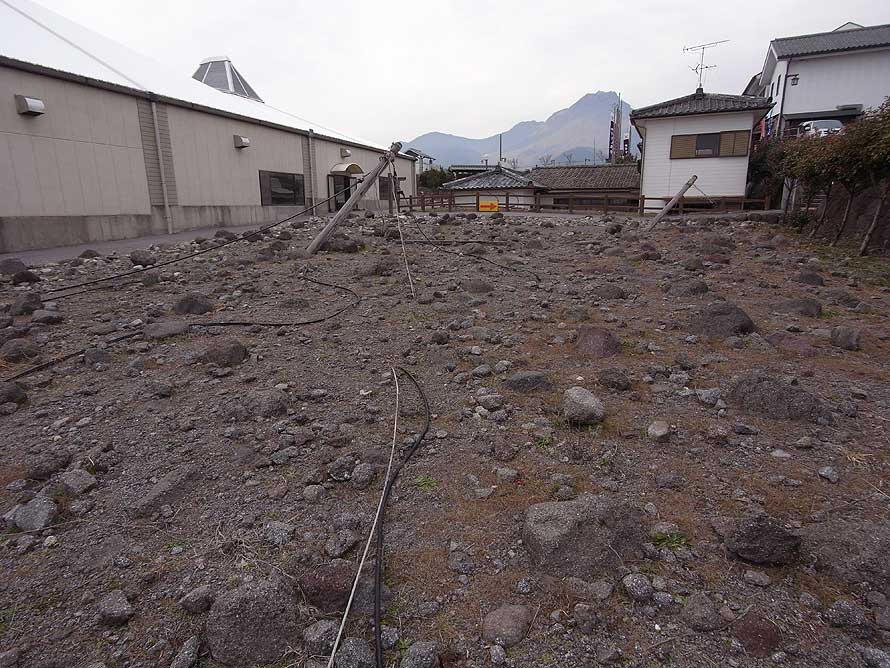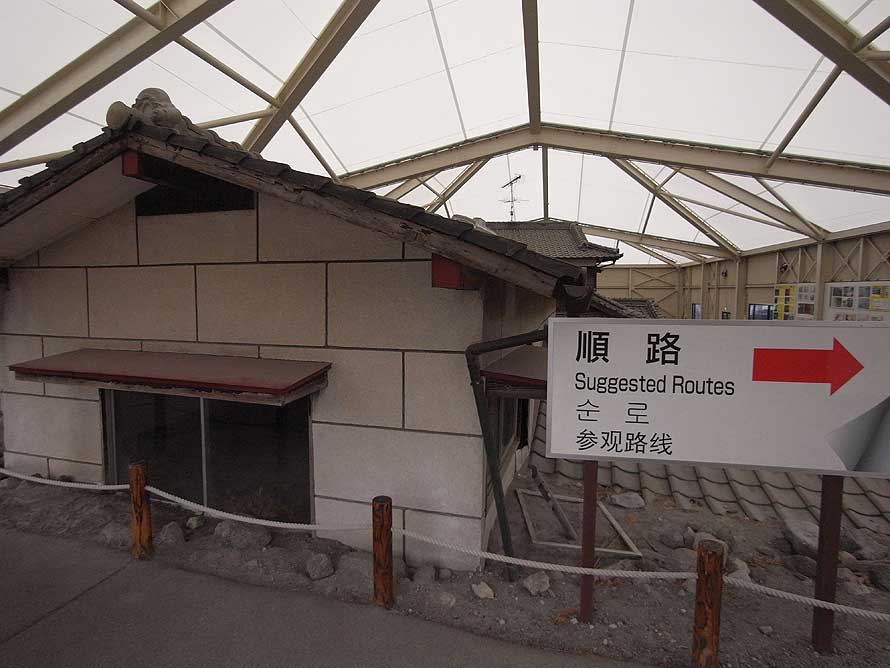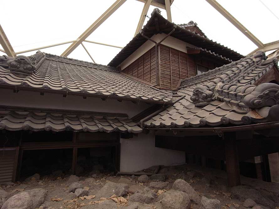 巨大な駐車場を抜け、中に入った。振り返ると普賢岳が雄大な姿を見せている。観光としての写真の絶景スポットでもある。まず目を引いたのが、隣接する「土石流被害家屋保存公園」であった。土石流に埋もれて被災した民家を、その一帯全ての地区ごと丸まる保存した災害遺構である(一軒のみ数十mほど移設した家屋もあるようだが)。