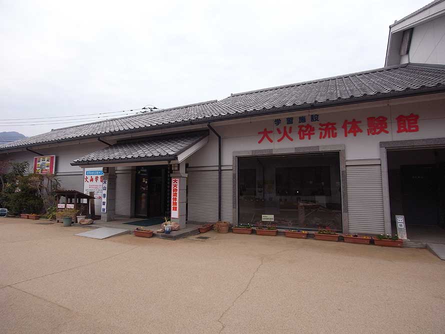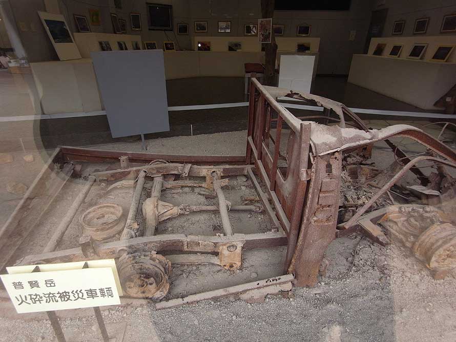 土産物などが並ぶ店舗区域に隣接して「大火砕流体験館」がある。窓からは、中に展示されている火砕流によって被災した軽車輌が見えた。かろうじて錆びた骨組みが残っている感じだ。
