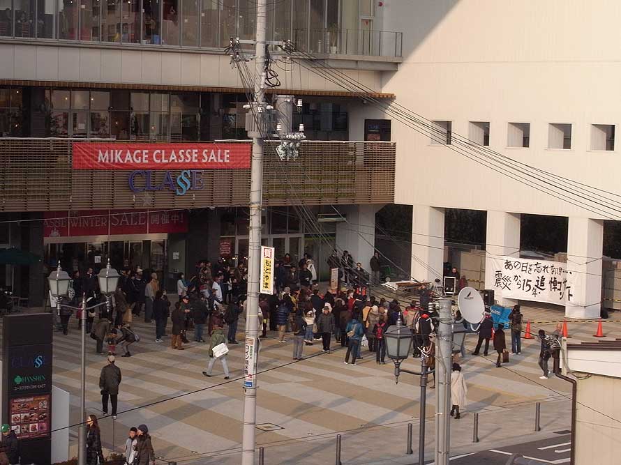 阪神電鉄御影駅で電車が停車してドアが開いた時、賑やかなメロディが耳に飛び込んできた。駅前のショッピングモール「御影クラッセ」の広場で催された1.17追悼コンサートのようで、「あの日を忘れない 震災15周年 チャリティーコンサート」のタイトルもホームから見えた。歌っている姿は客の陰で見えなかったが、ちょうど砂川恵理歌さんが歌っていた時のようだった。その芯の通った力強う歌声に惹かれ、思わず降車してしまうほどだった。しばらく停車していた列車の車掌も、表情を見ていると耳だけはしばしの感傷に寄せられているかのようにも映った。
