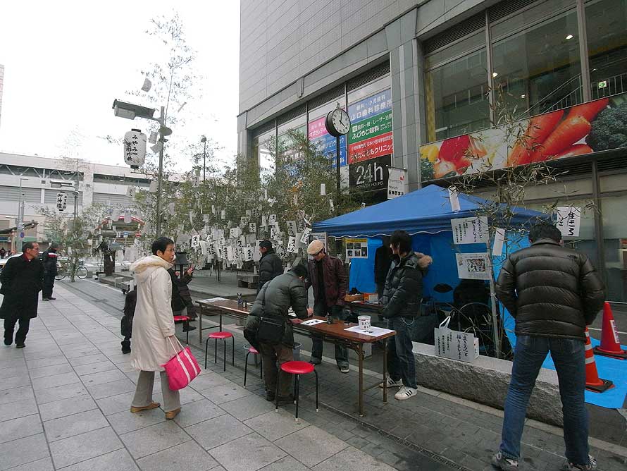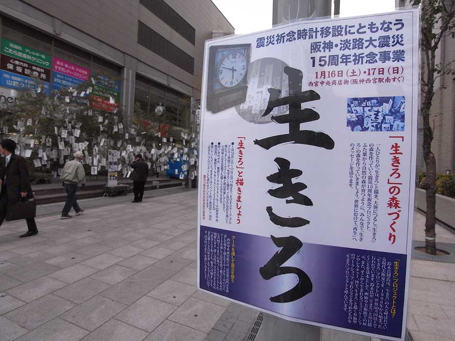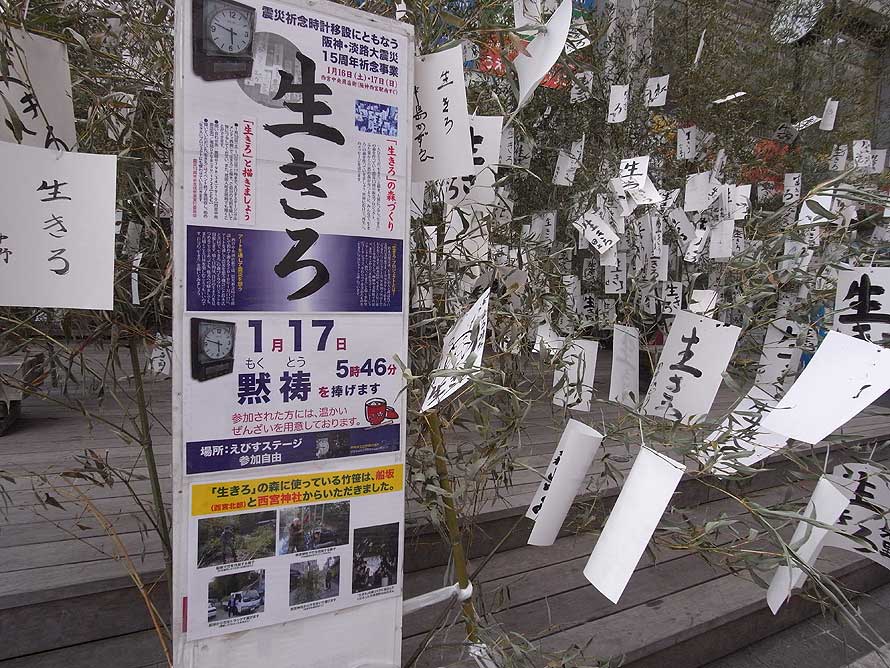この時計の周囲で、震災15年イベントが行われていた。辺りにはたくさんの笹が立てられて、まるで七夕の短冊のように「生きろ」と書かれた紙が吊されている。この「生きろ」は、宝塚市在住の現代美術家鈴木貴博氏の"「生きろ」プロジェクト"の一つで、商店街とコラボレーションした震災追悼イベントである。鈴木氏は世界各地で「生きろ」と字を書くパフォーマンスを行っているそうで、昨年(2009年)に行われた「西宮船坂ビエンナーレ2009」というアートイベントにこれを出品したことが、今回のイベントに参加するきっかけだったという。