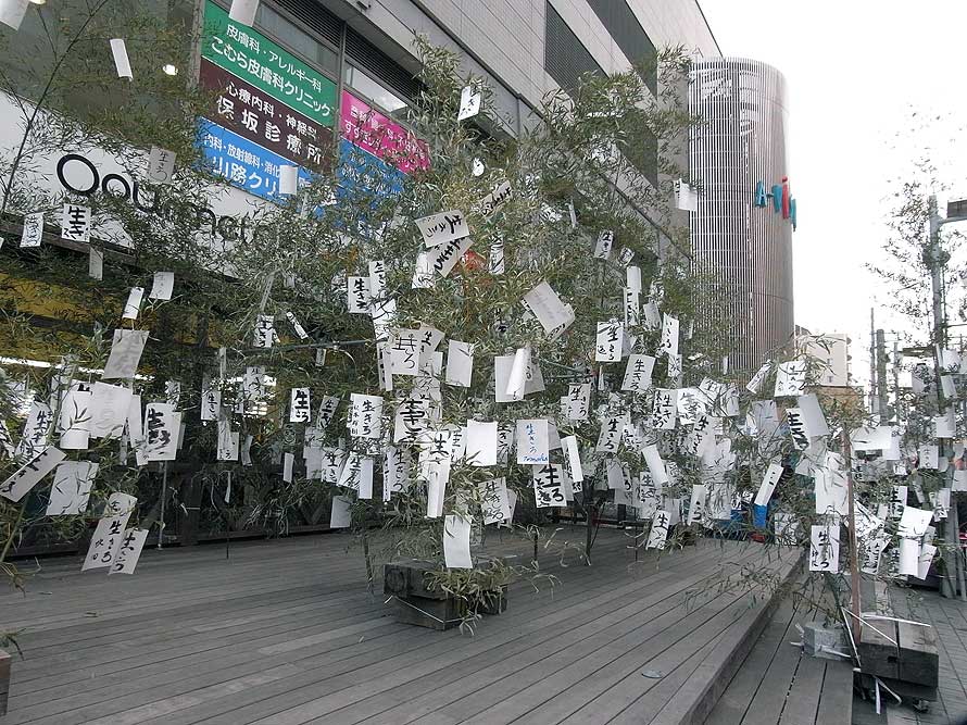 これは市民参加型のアート・パフォーマンスなので参加も自由で、見ていると道行く人たちも結構興味を持って立ち寄っている。それぞれの好きな言葉ではなく、ただ「生きろ」という同じコトバなのだが、紙に書かれた個人個人の文字の個性の差異によって、その短冊の数がすなわちプロジェクトに参加した人の数だと視覚的にも伝わってくる。同一のテキストだと無個性なのかとも思っていたが、じっくり見ていると以外にも個性的であり、筆跡というのが案外ミソになっているのかもしれない。