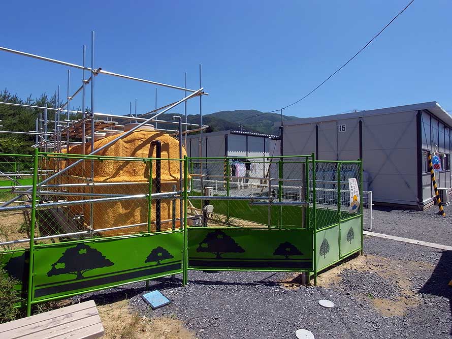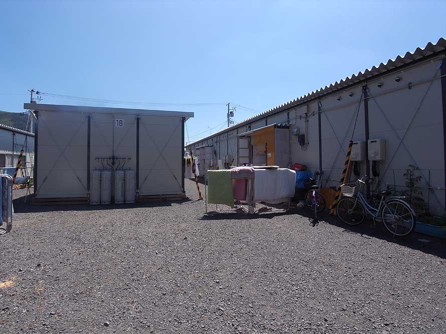 仮設住宅の脇には大きな黄色いタンクが並んでいた。こんな施設は神戸では見たことがない。何かと思い洗濯物を干していた方に尋ねると、これは下水処理を行う浄化水槽だとのこと。もともとこの周辺は市街地ではない。津波の被害の及ばない高台に仮設住宅を建てようと用地を探してみても、宅地として上下水道が完備された条件の整った土地はなかなかないのだろう。そのために仮設住宅団地を整備しようとする際には、住宅の建屋だけでなくこのような関連施設も同時に併設しなければならないのだ。