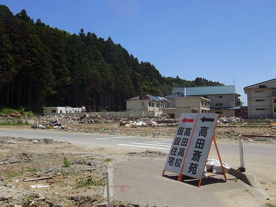 そしてこの崖の直下には、覆い茂る木々によって視界が遮られているが、このグラウンド敷地の所有者である岩手県立高田高等学校があるはずだった。低い標高に位置した高校校舎は津波で全体が水没し、生徒や関係者も犠牲になった。現在は遠く離れた大船渡の校舎に間借りしているという。こうして建つ仮設住宅の敷地の一つひとつにも、物語がある。