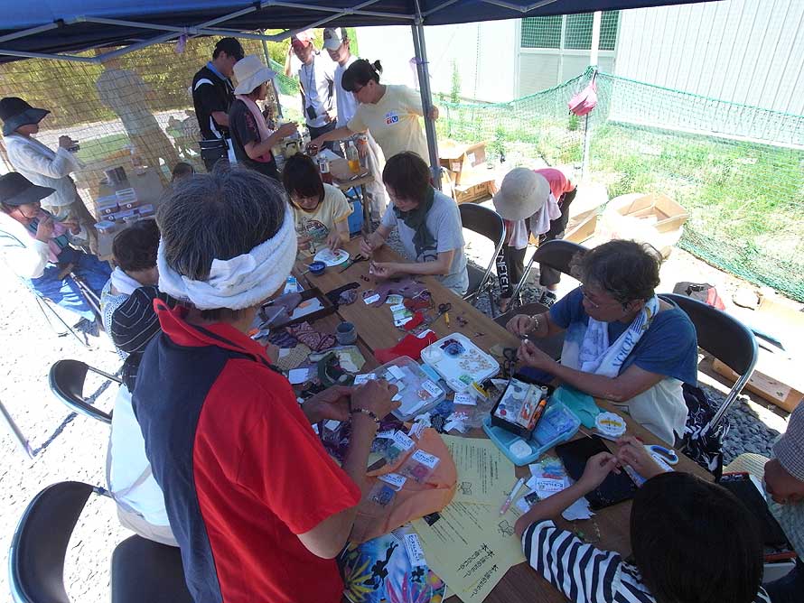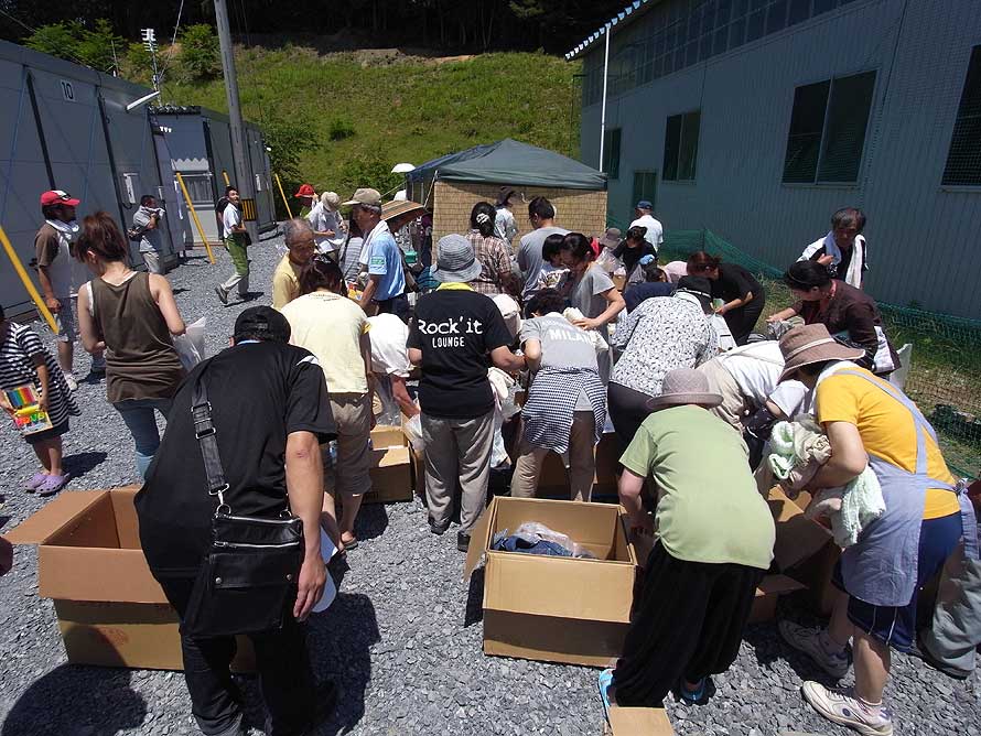 まごころネットの催しを覗いてみる。タープの中で行われていた手芸教室には、10人ほどもの人が参加をしていた。お茶やあんみつのお接待もある。奈良の作業所の人が付けたという塩分濃度のとても濃い本来の梅干しも配っていた。外側では子どもたちの遊び相手をして、一緒に野球をしている。箱に入った支援物資は、本からおもちゃ、食器や衣類、小物など種類も量も幅広い。どれもが全国から送られてきた物資だという。