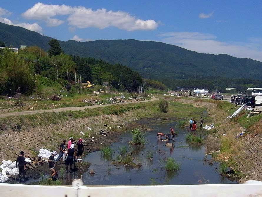 高田高校グラウンドを撤収し、次の図書館開設地に向かう。次は6kmほど離れた広田半島にあるため、海沿いの道や山道を往く。途中の道路は、津波で路面のアスファルトが剥がされており、凸凹の砂利道を徐行して走る。復旧の気配すら感じない大船渡線の線路を渡る。瓦礫の残った小川には、炎天下で撤去作業をするボランティアチームの姿見える。この天候では過酷な作業となっている。