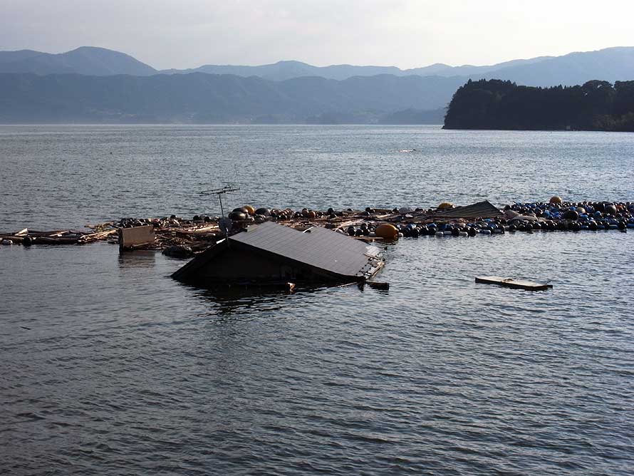 道沿いの電柱の上の方には、いまだに津波で引っかかった瓦礫がそのままにぶら下がっていた。海にはどこからか流された家の屋根が頭を覗かせ、漁具の浮きや漁網が滞留している。津波の押し寄せた陸地も、地震で地盤沈下した土地に水が溜まり、湿地帯のような趣きもする。しかし傍らには、小さなひまわりが踏ん張って咲いている。
