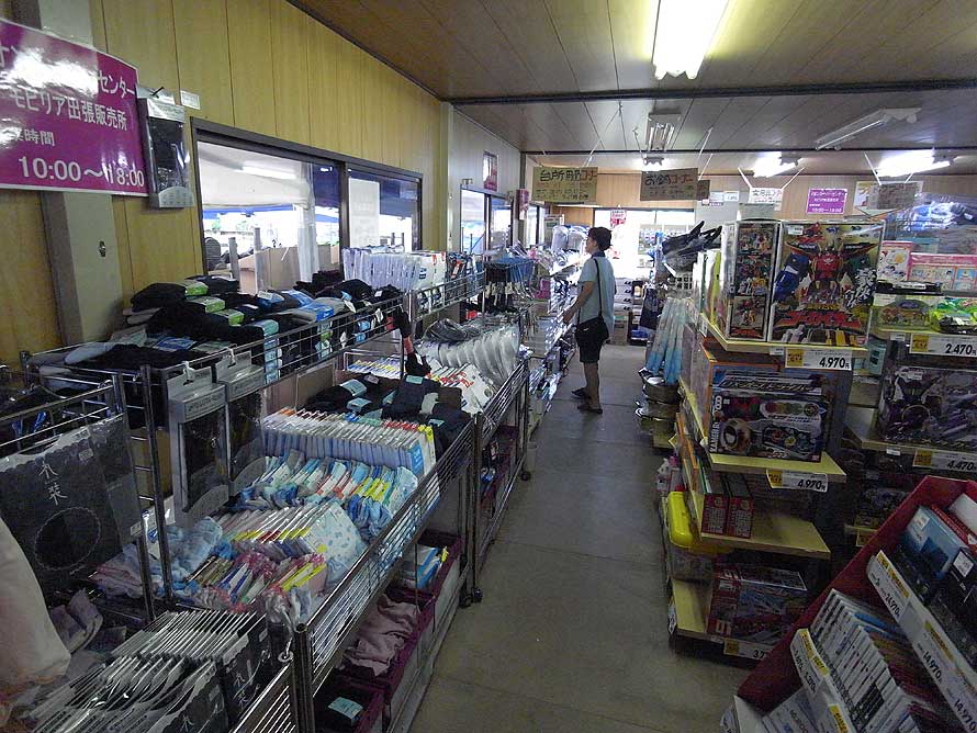ライフラインは整っているし支援の手も他には見られないほどに充実しているが、旧市街地からは遠く離れた山の中であり、車がないとどこにも移動ができないのが厳しい点かもしれない。近隣にあった商店なども被災したために、買い物にはとても不便な場所だ。そこでここには6月10日からスーパーマーケットのイオンが、臨時店舗「イオンスーパーセンターモビリア出張販売所」を出店していた。もともと物産店などの売店があったのだろうか、常設の店舗棟をまるまる一棟と仮設プレハブにテントを数張とで幅広く店を広げていた。