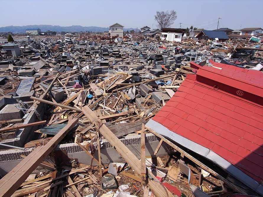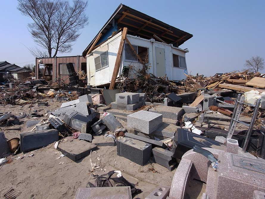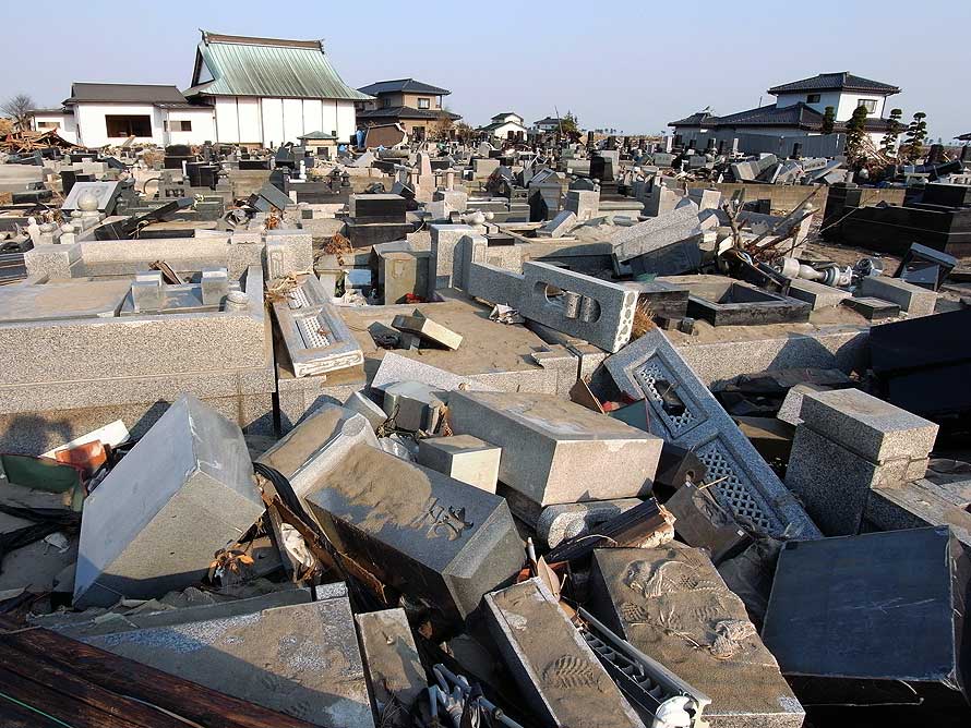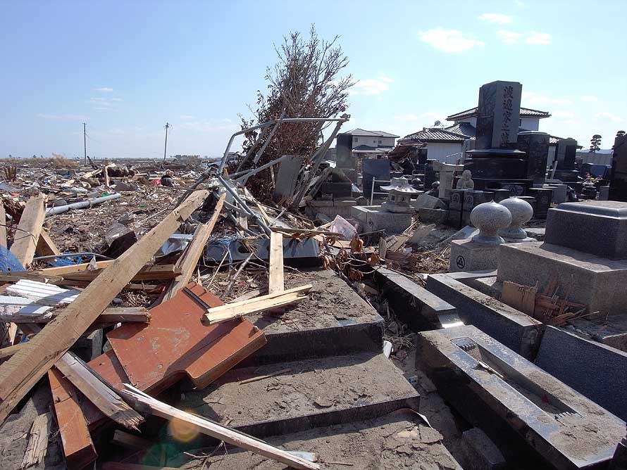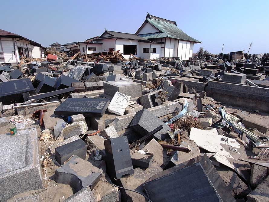 宮城県亘理町の「補陀山 海蔵禅寺」は、鳴き砂で知られた吉田浜海岸のある吉田浜集落の外れにある。海から流れてきた津波は黒い濁流となり、家屋を巻き込みながら内陸部へと流れていった。海蔵禅寺は海岸から800mほど離れた集落の外れに位置したためか、津波の勢いも削がれかろうじて本堂の形は残した。しかしその裏に広がっていた墓地には、たくさんのがれきが流入した。