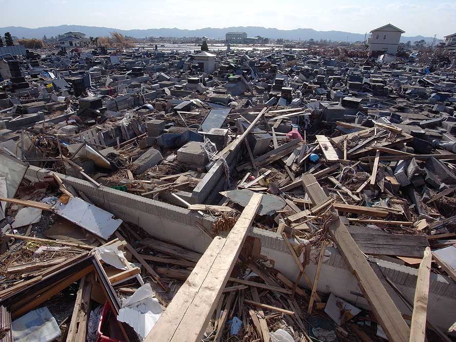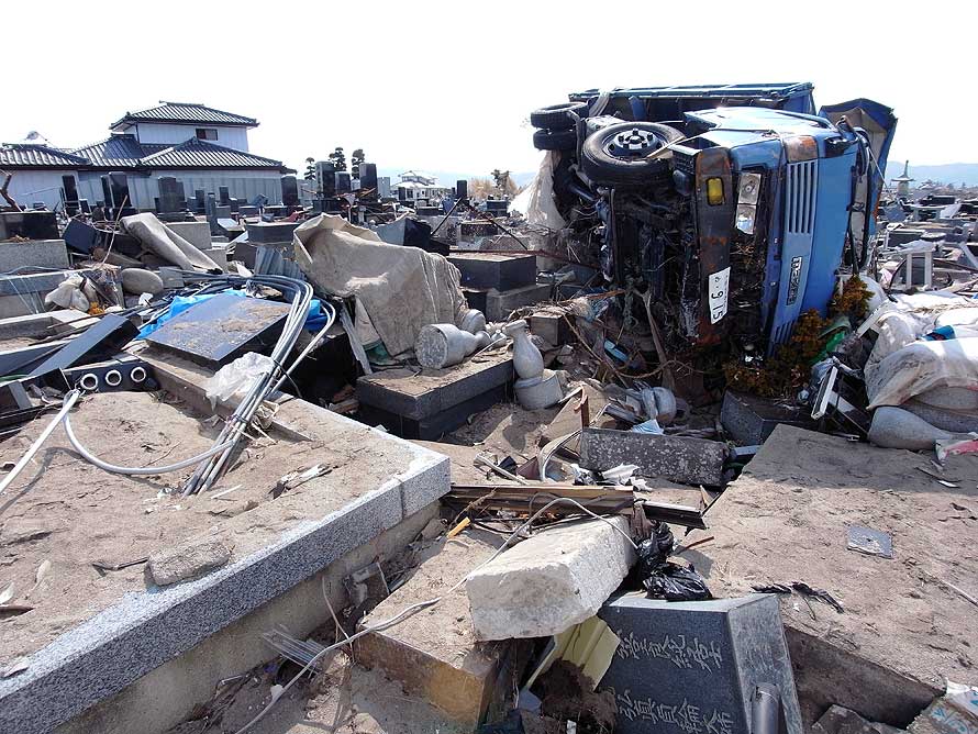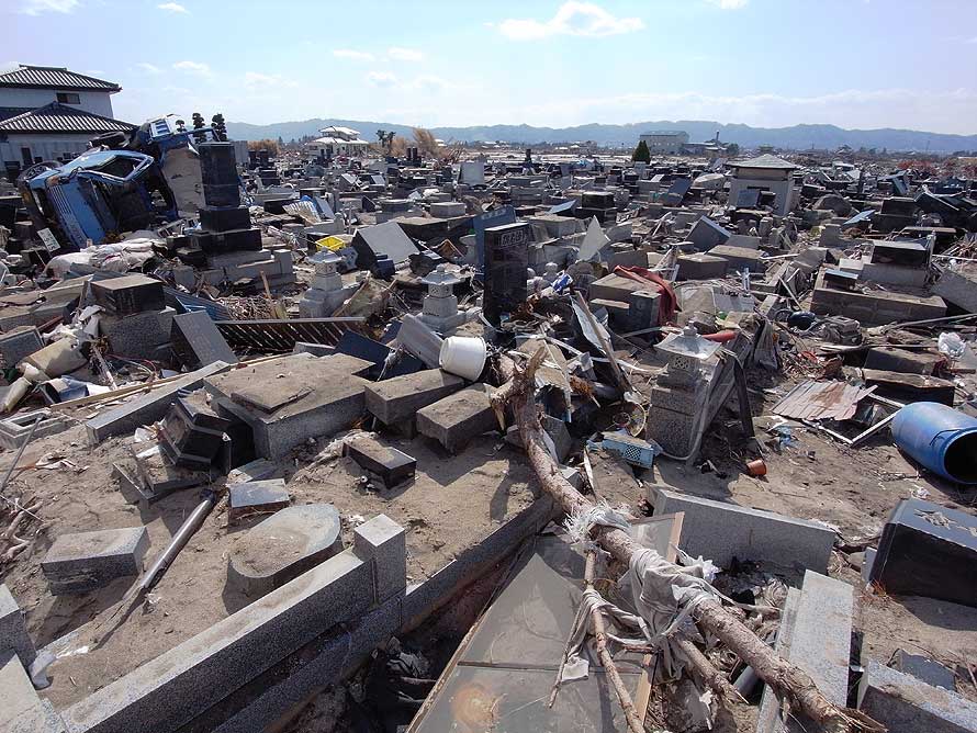 墓石はことごとく倒された。車やトラクターなどの車両や家屋の2階部分などの巨大なものや、丸太などの流木が流れ込んでいる。倒壊した家屋から流出した家庭用品も散らばっていた。