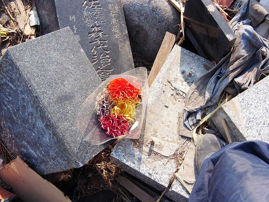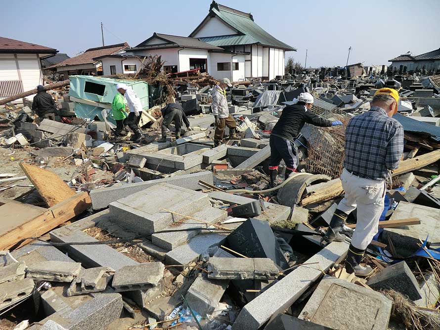 こうして墓地に流れ込んだがれきは、重機も入れないために一つ一つ人の手で運ぶしかない。墓石は横倒しになり、骨壺も割れお骨も晒されていた。護持会(檀家)の有志の方と近隣のお寺の方、そして他県から来たボランティアの手により、少しずつ墓地のがれき撤去の作業を始めた。