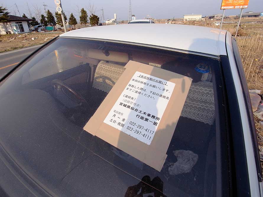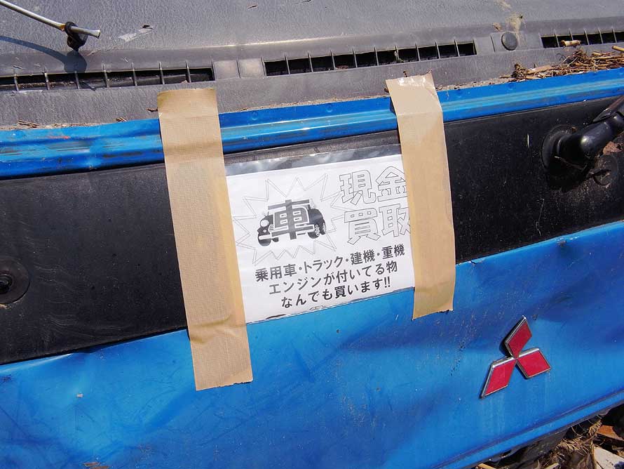 驚いたことに、どの被災車輌のフロントガラスにも、必ずと言っても良いほどチラシが貼り付けられていた。それは県による持ち主への撤去要請の書類であったり、あるいは廃車解体業者の買い取り案内のチラシであった。
